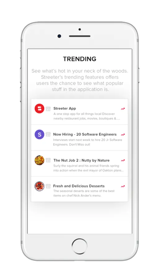 See what's hot in your neck of the woods. Streeter's trending features offer users the chance to see what's popular in the application it can be food nearby, restaurants nearby, movie theater nearby, shopping nearby, malls nearby and even places hiring nearby any outlets nearby.