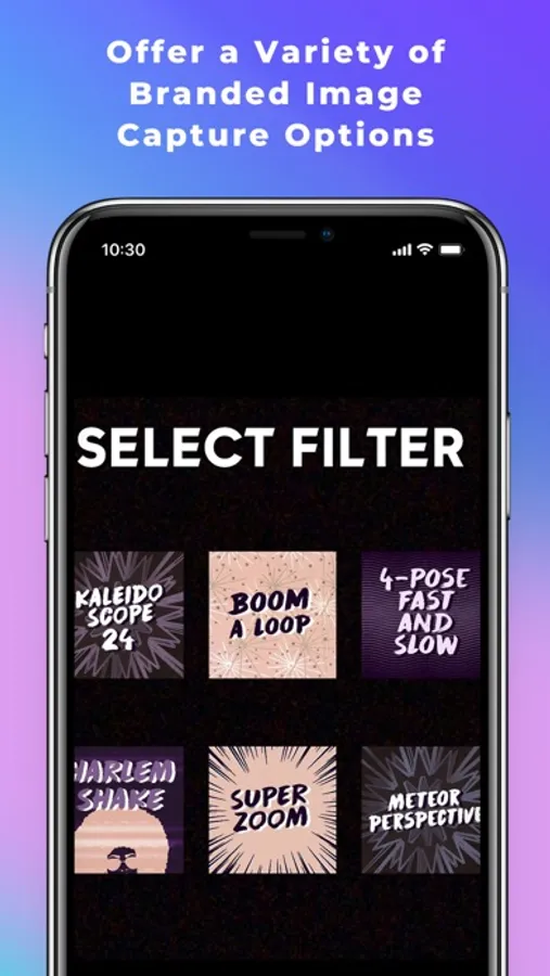 - Add any number of creative options to the attract screen so consumers can select from numerous fun branded filters.