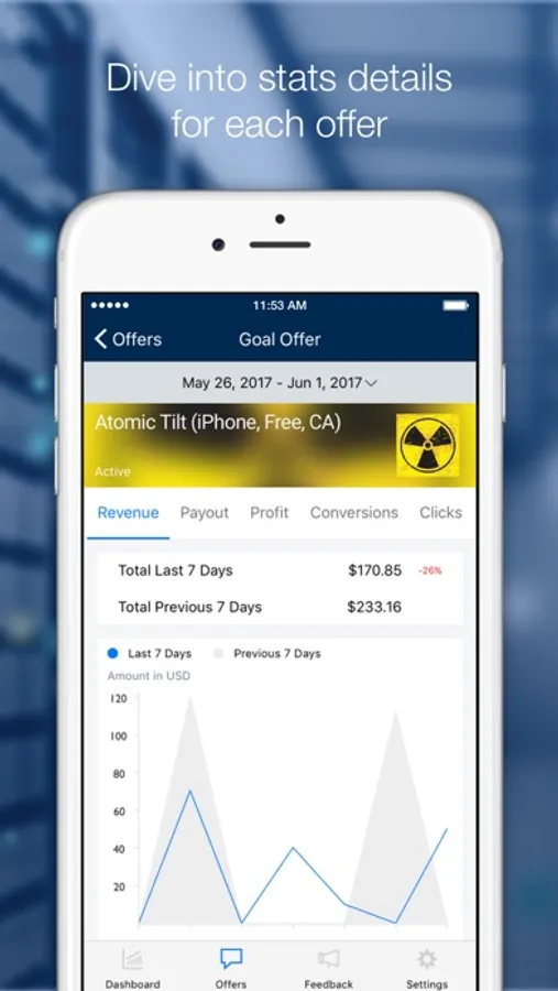 • See totals for revenue, clicks, conversions, payout and profit