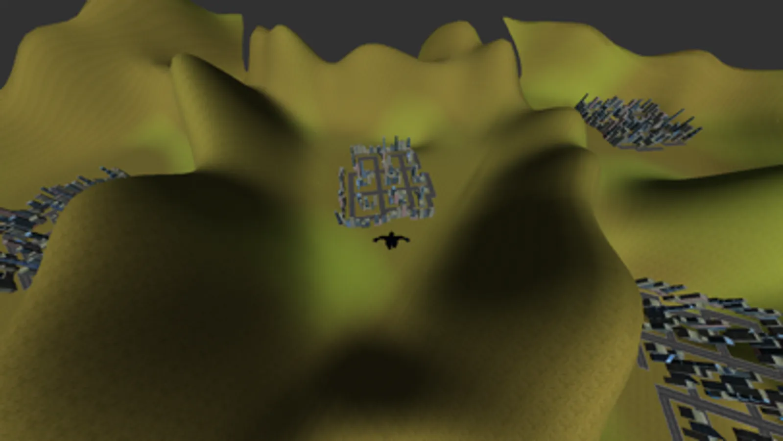 This is a simulation of a flying man. You can fly or run wherever you want. Collect power and fire them at cities to destroy.