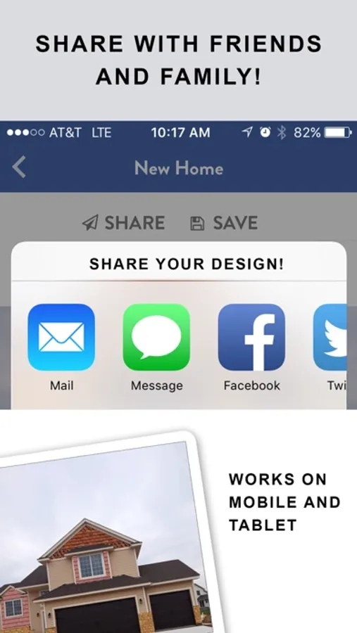 4. Share It: BluePrintz constantly autosaves your work, so it’s always ready. Easily share your personalized design image with others or export it to your photo library. When you’re ready, share your designs with your home builder to get your dream home started!