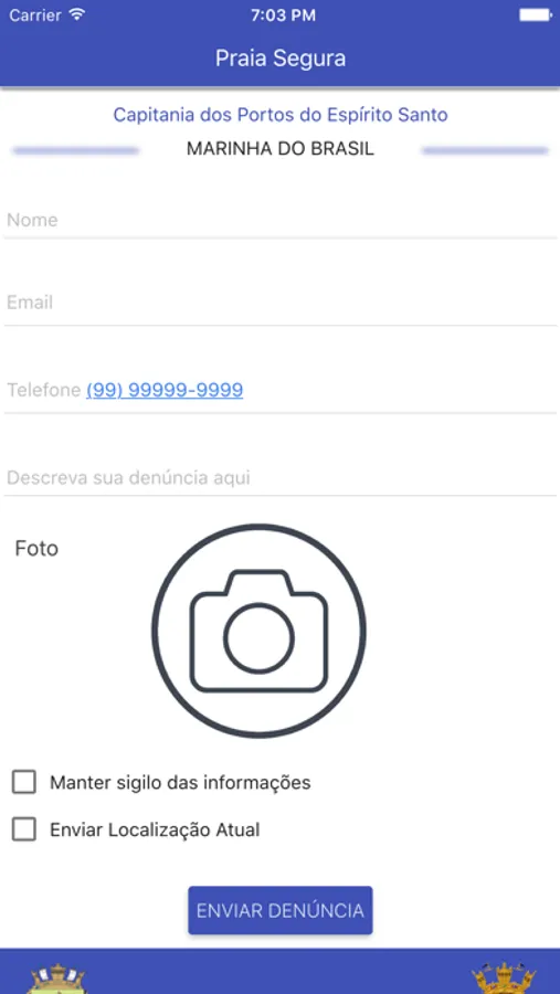 Permitir ao cidadão fazer denúncias preenchendo um cadastro simples com possibilidade de envio de fotos. Estas informações serão enviadas para uma caixa postal específica, para um posterior tratamento pela Capitania dos Portos de ES.