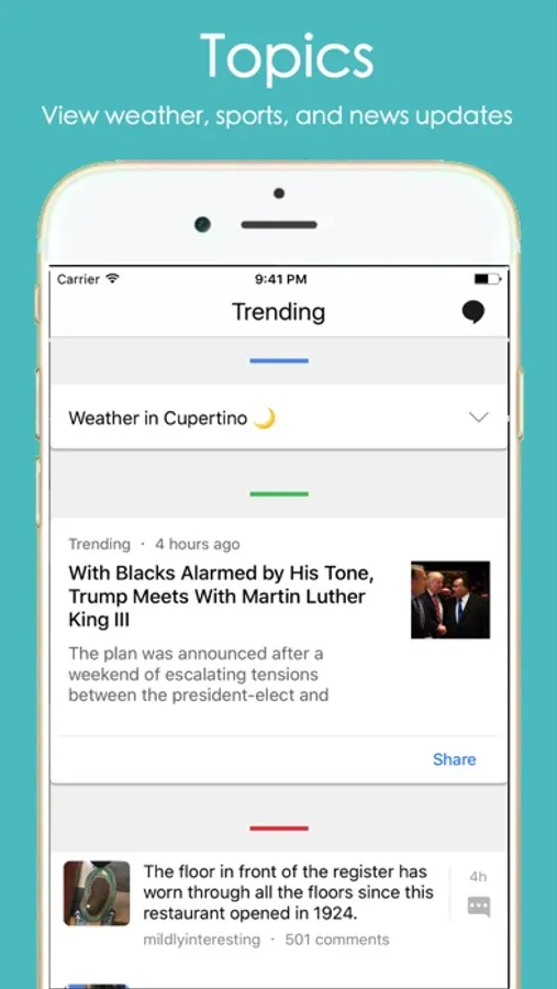 Stay up to date on the latest trending news, weather, or sports scores from topics you care about.