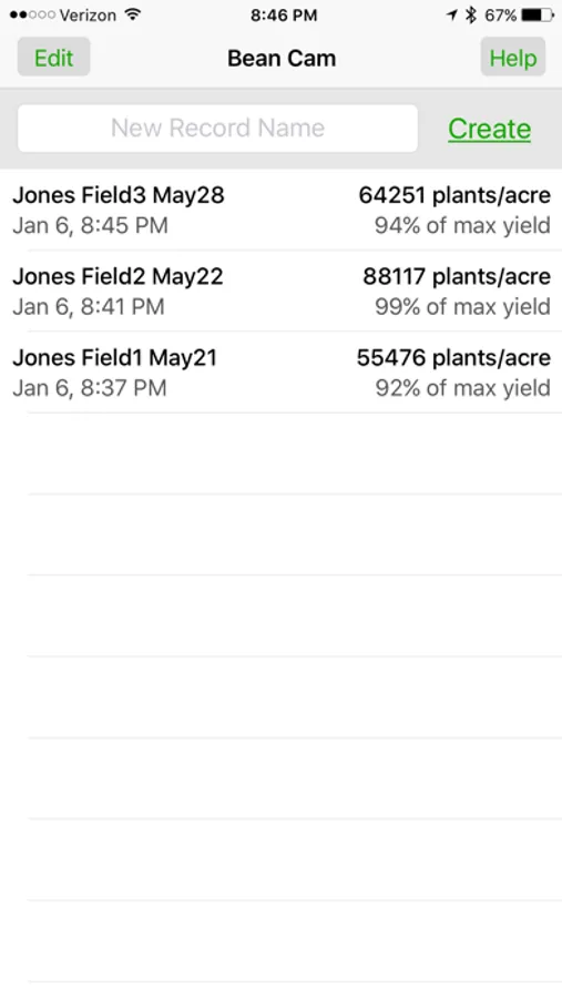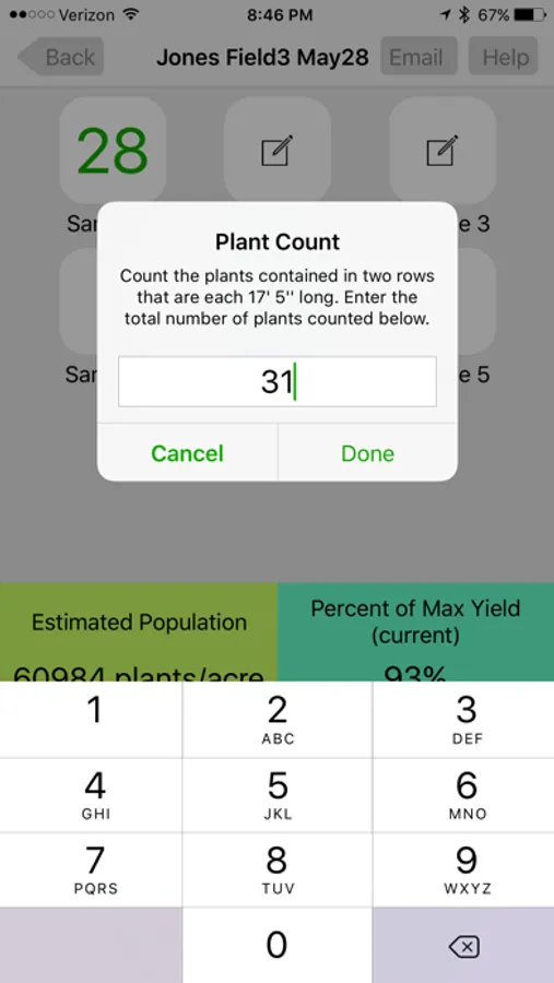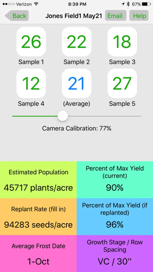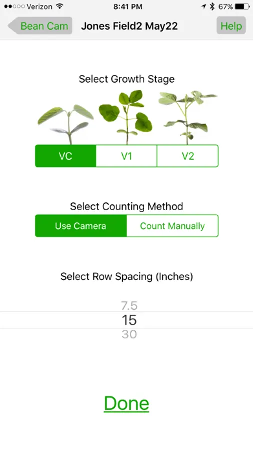 To take the field samples you can manually count measured rows of plants, or you can use you iPhone camera to automatically count plants. There is a help screen in the app that will get you started. It is as easy as holding your iPhone at arm's length and shoulder height out in front of you, with the camera facing down toward the plants at your feet. There are lines on the camera preview to show where the plant rows should line up.