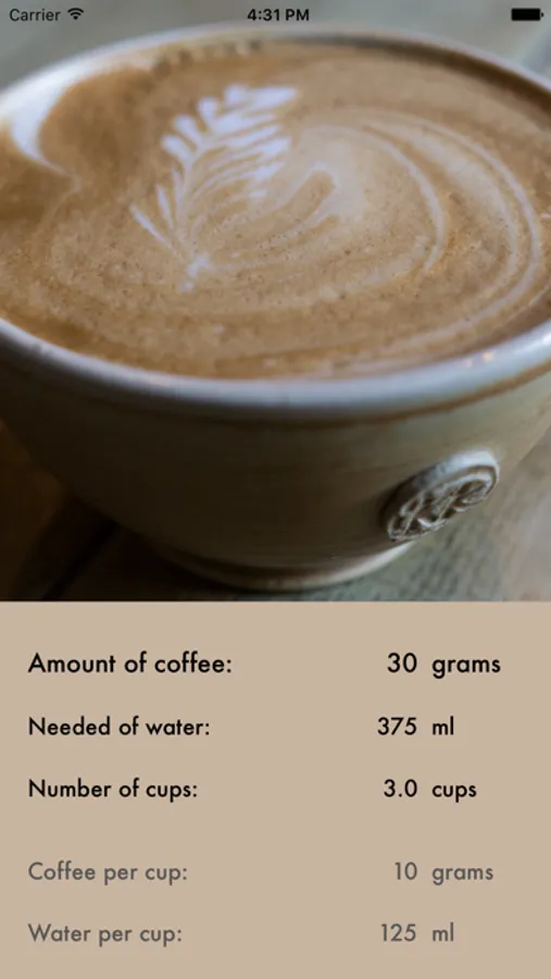 Do you grind your own coffee beans and struggle with how much water to add? This app helps calculate how much water to add for a given amount of ground coffee. You can adjust how much coffee as well as water to use per cup.