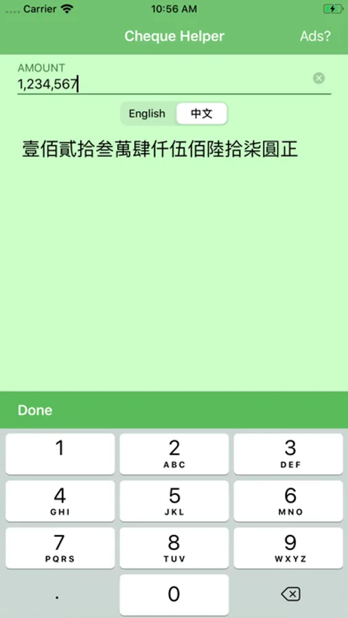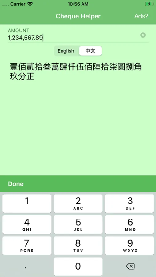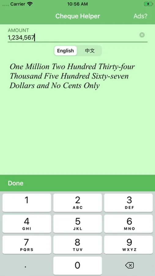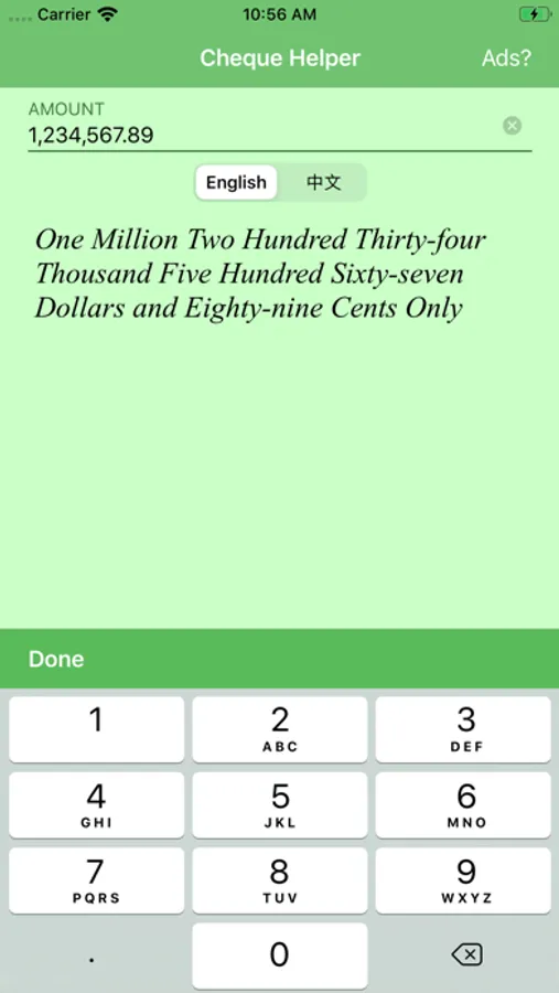 Feeling difficult translating numbers to words when writing a check? This app is for you! Just enter the amount and Boom! Your amount is translated into words! Not only that, you can also translate the number into Chinese as well!