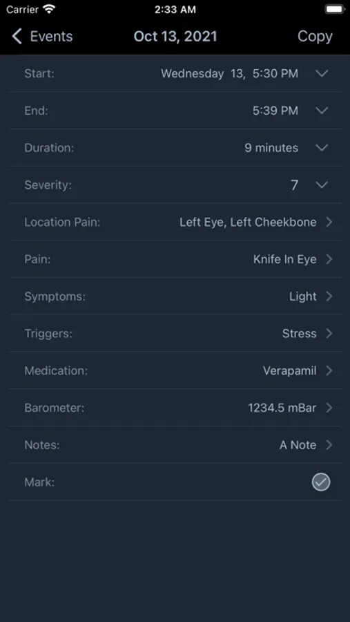 Record duration, severity, pain location, triggers, symptoms, medication, atmospheric pressure, etc.