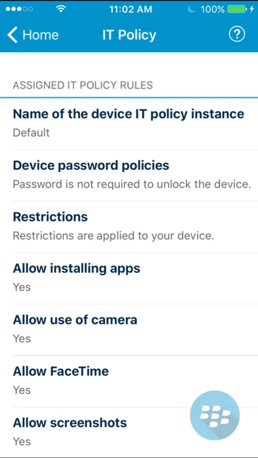 Additional security and enterprise mobility management capabilities are available for BlackBerry UEM-managed iOS devices with BlackBerry® Dynamics apps such as BlackBerry® Work installed, including: