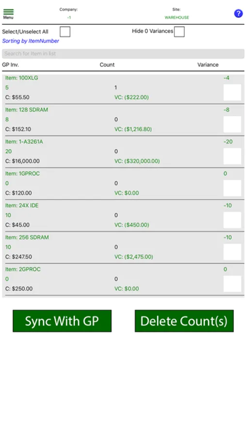 Create inventory counts on your device, compare those counts with Microsoft Dynamics GP inventory, and update GP inventory. We use Dynamics GP Web Services to retrieve inventory information from GP including item numbers, item descriptions, current/standard cost, and UOM information. We then create inventory variances in GP using Dynamics GP Web Services to ensure data integrity. Multiple users can enter counts at the same time.