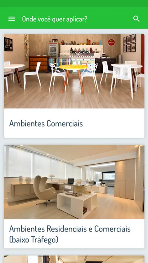 Sua casa está sem graça? Os pisos da sala estão precisando de mais vida, mas você está sem inspiração? Nosso aplicativo resolve isso! Em “Ambientes que inspiram”, você encontrará lindos ambientes, cheios de charme que, além de inspirar, trazem todas as informações dos produtos que foram usados para produzi-los. Quer coisa mais fácil que isso? Agora você não tem mais desculpa para deixar o piso sem graça!