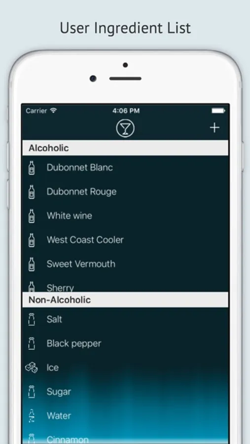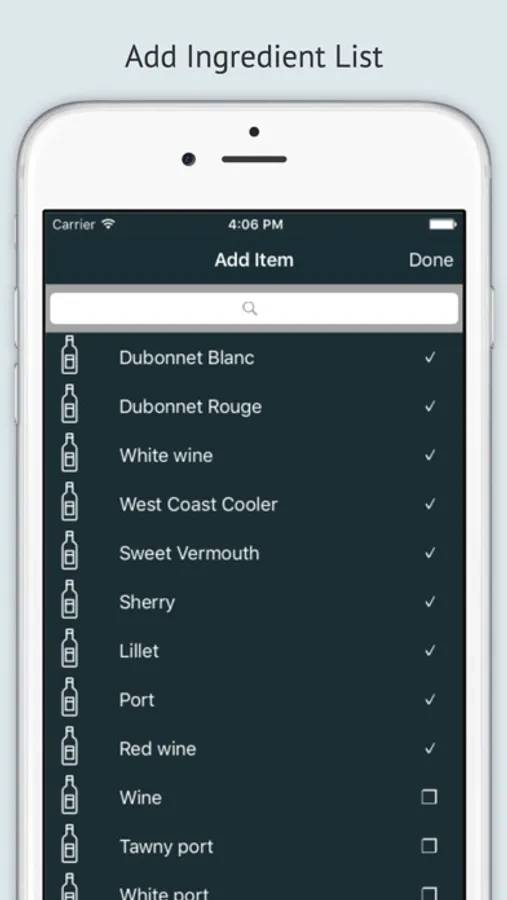- Ingredients list of your own that you can add to, delete and save whenever you buy a new liquor or run out.