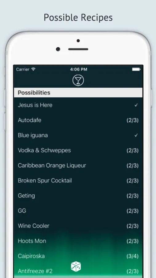 - Random drink picker that randomly selects a recipe that you can make with the ingredients you have.