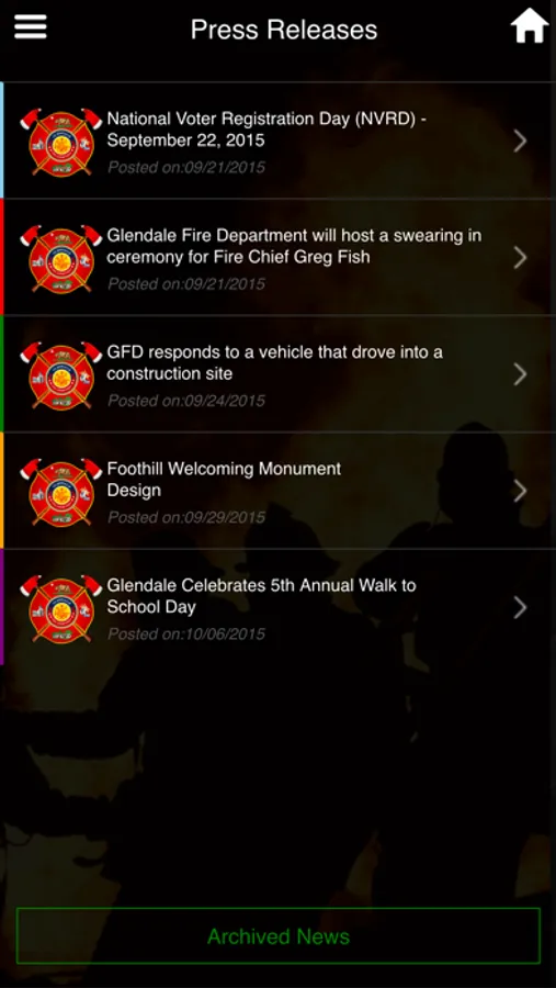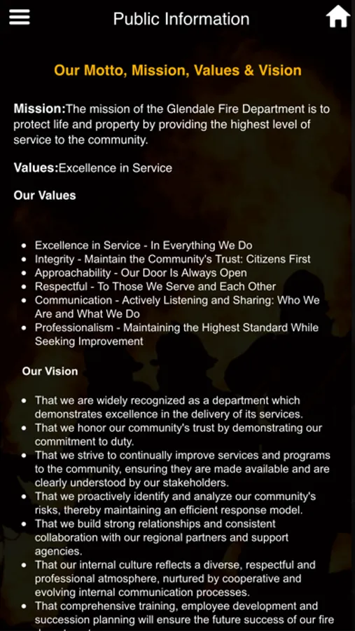 The Glendale Fire Department Mobile App is a information app for Glendale Fire Department Public Info, Events, News Releases, Incident Updates, Social Media, Fire Alarm Information, Scheduling Tours, Service Feedback and Notifications.