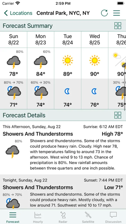 Avanti Weather, or AWeather for short, is a weather app for iDevices (iPhones, iPads, and iPods) that lets you manage weather forecasts from NOAA (the National Oceanic and Atmospheric Administration) and the National Weather Service (NWS) while you're on the go and away from the internet. Weather data can be downloaded for multiple locations when you have a net connection and can be viewed later whether you have a net connection or not. In addition to using the accurate NOAA/NWS forecast data, you can get the forecast for where you want it and not only for major metropolitan locations.