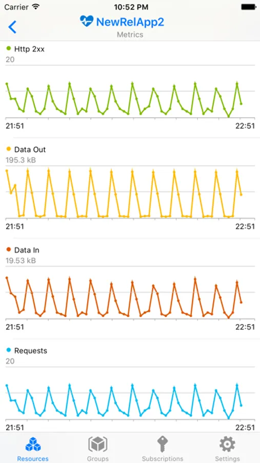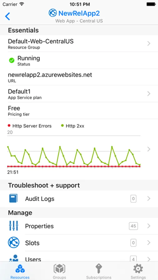 * View monitoring charts to see the health and usage of your resources over the last hour