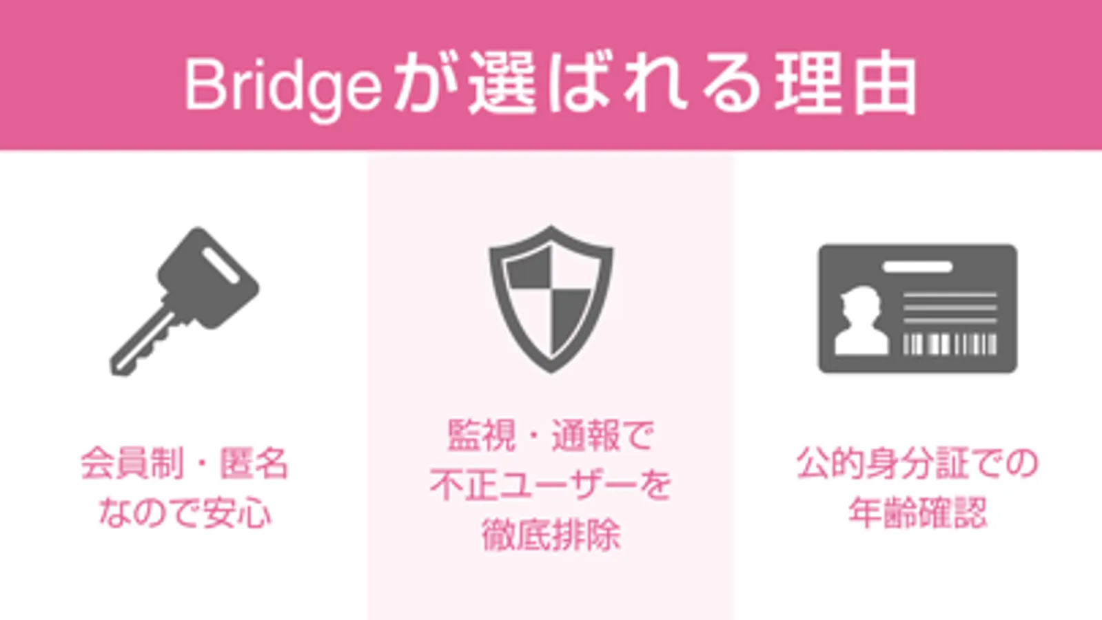 ※ Bridge(ブリッジ)は従来のゲイアプリとは異なります。審査ありの完全会員制を採用することに加え、免許証などによる年齢確認、弊社独自の監視体制による不正ユーザーの排除などにより、ゲイアプリとして、安心・安全にユーザー様にご利用いただける環境を整えています。