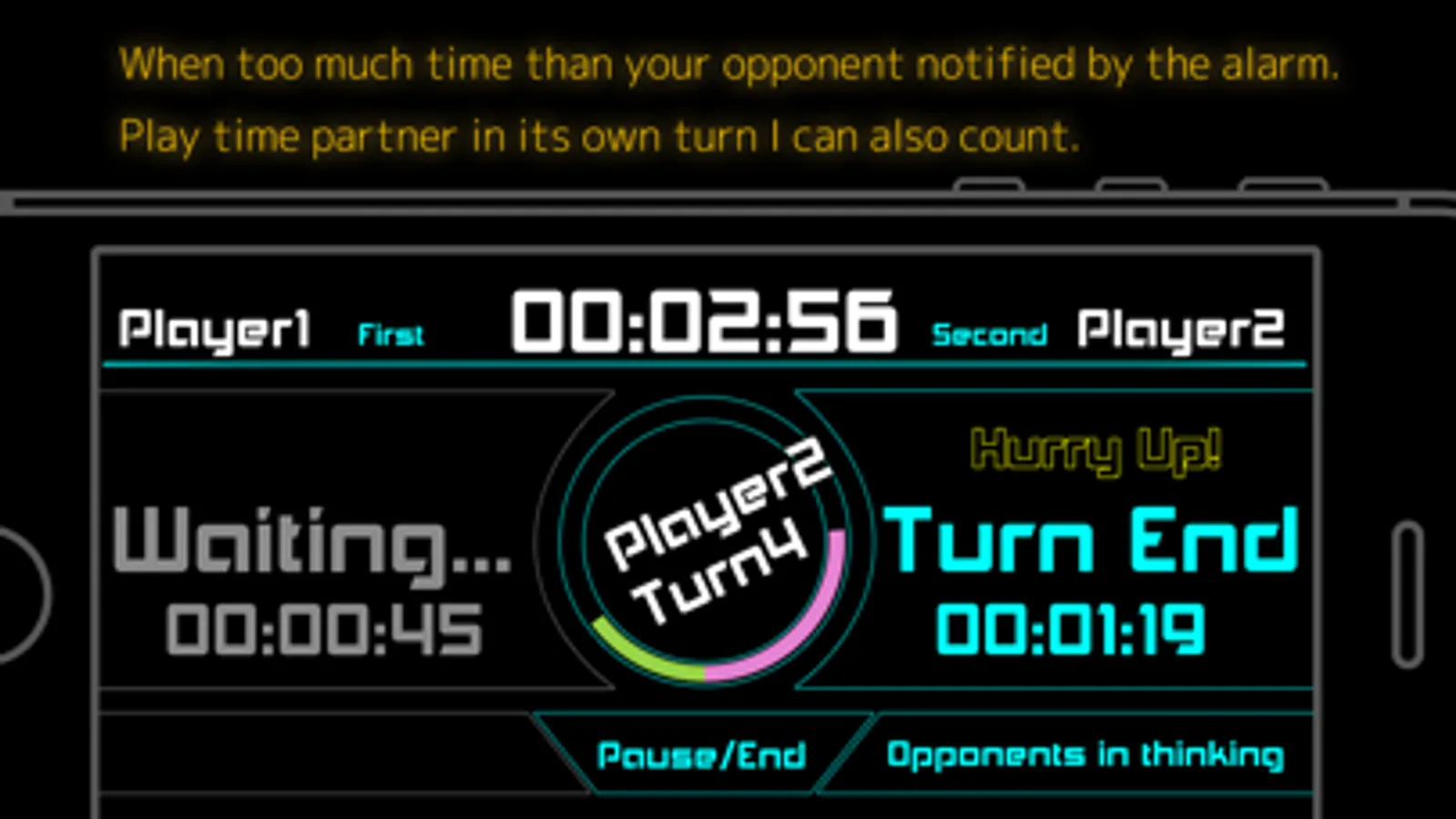 Use time of each player are digitally displayed in turn end button, and will appear in the pie chart-like by the middle of the gauge. Thus, it has been or visualization are using how time players.