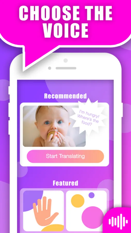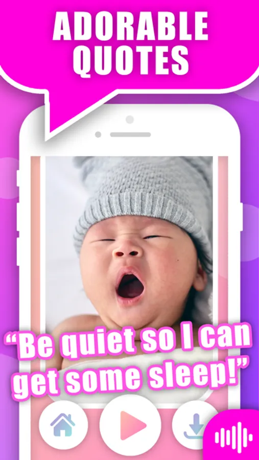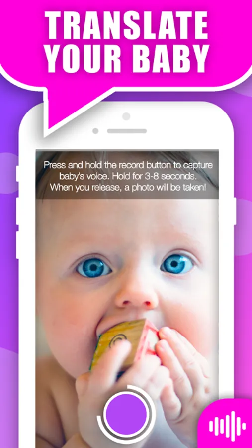 Start Baby Translator by capturing any baby's sounds and snapping a cute photo. Within seconds, you'll get to play back your baby's hilarious quote. Play, save, and share as much as you like! Access the voice settings to give your baby whatever voice you want!