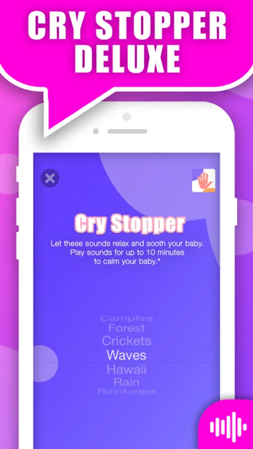 Tired of a whiny baby? Stop their cries with Cry Stopper. Choose from a selection of sounds to help calm your baby. Sooth them to sleep with the sounds of nature. Hey, you may just enjoy it, too.