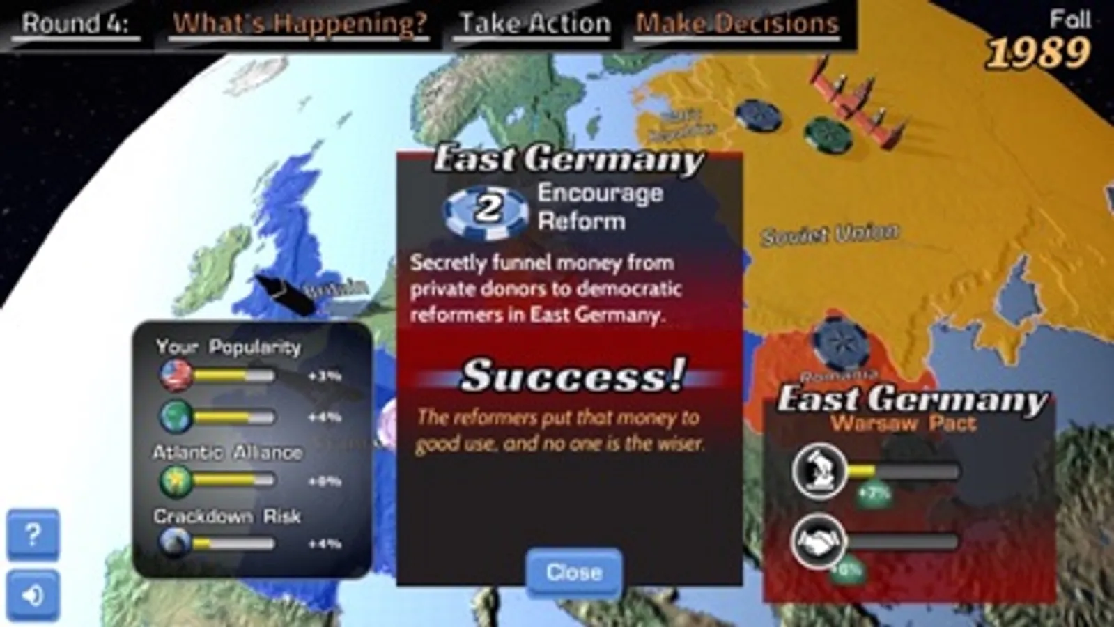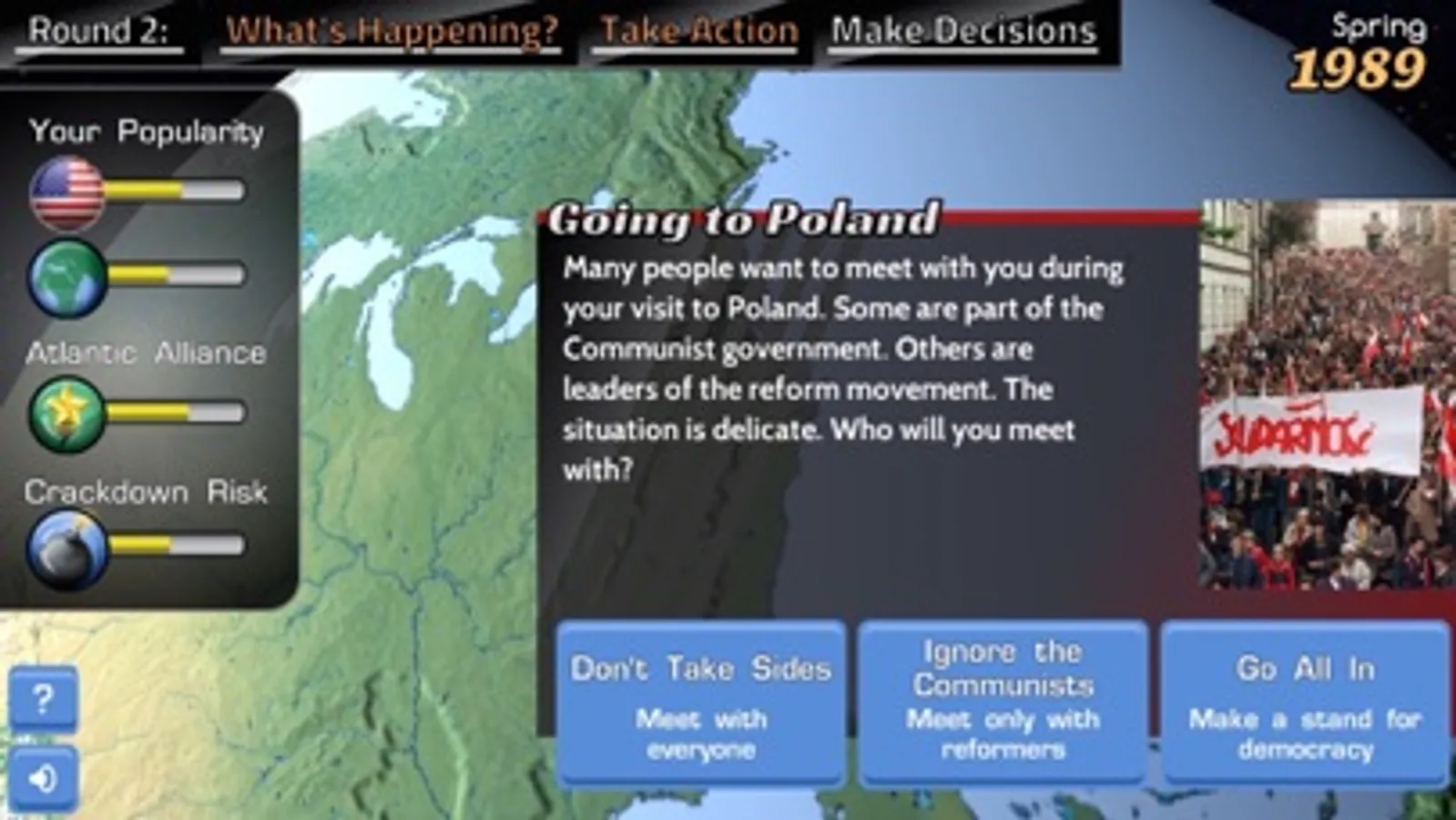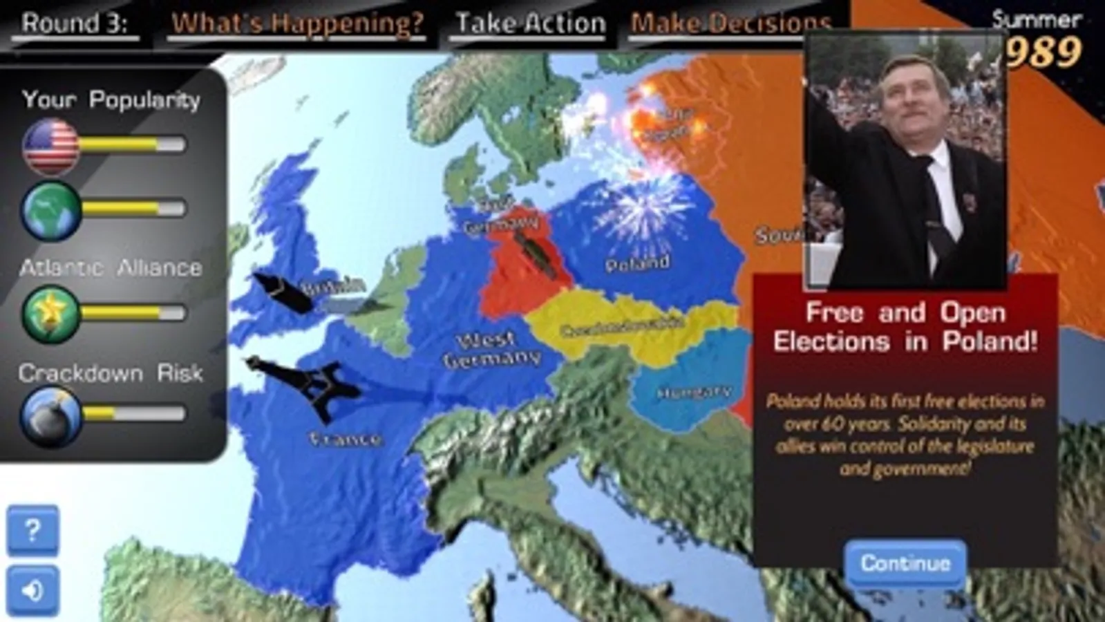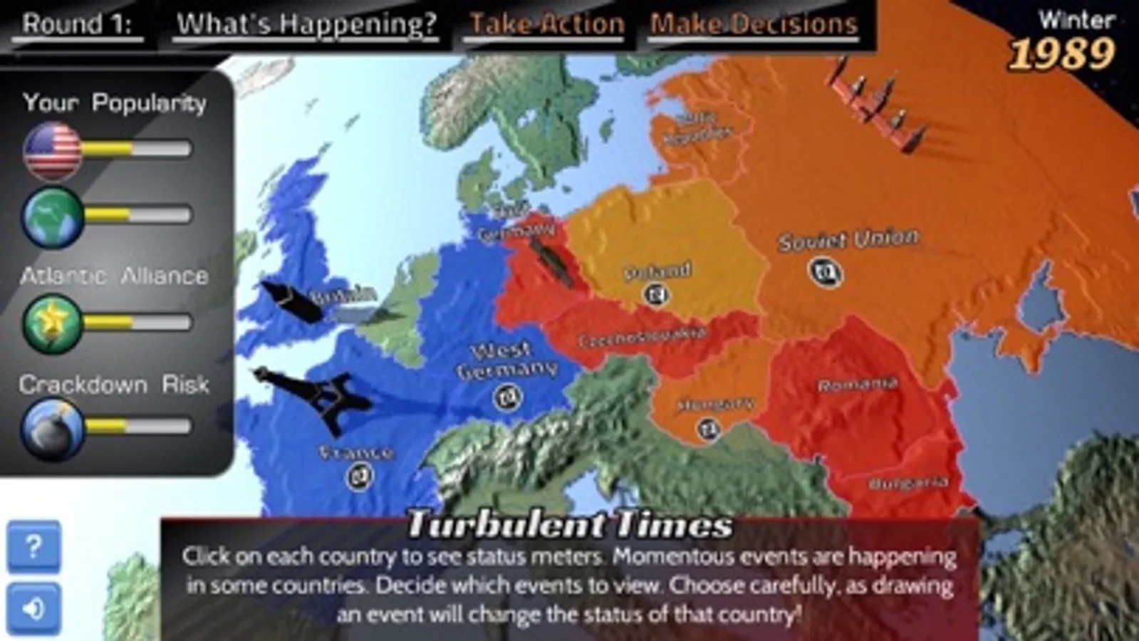 The year is 1989. You are President of the United States in transforming times. After forty years of oppression, the people of Eastern Europe are daring to defy their Communist overlords at home and in the Soviet Union. And as President, you too face daring decisions: how far will you go to encourage democratic reform? How much will you risk a Soviet crackdown on these freedom-seeking peoples? Will your efforts help bring democracy to Eastern Europe, or will you provoke the Soviet Union to bring down its wrath, setting the cause of freedom back by decades?