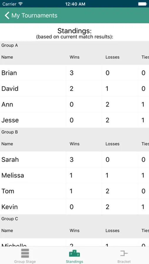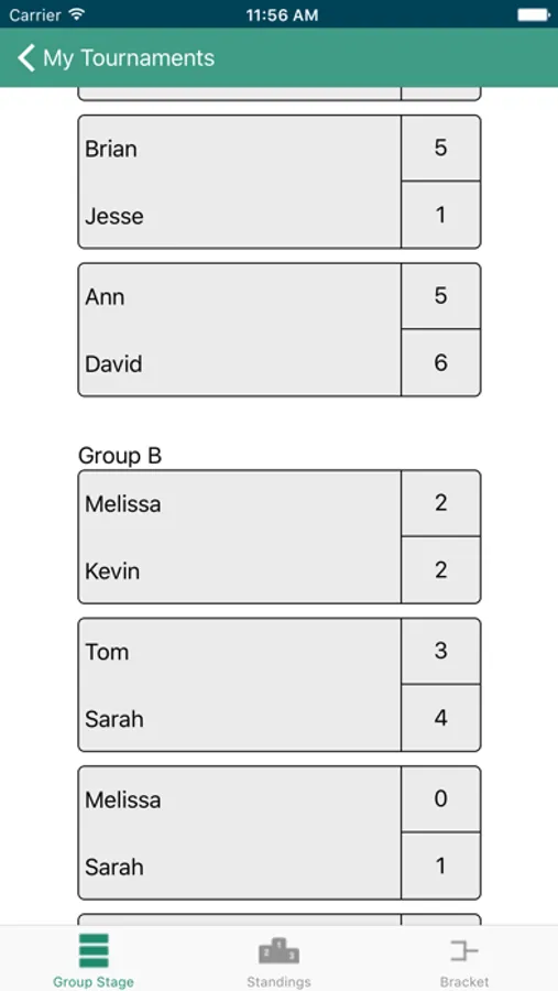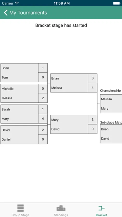 Create a tournament by selecting a format and adding competitors. As the tournament progresses, you can update scores and view standings. TournaMake will automatically determine the next rounds of the tournament matches.