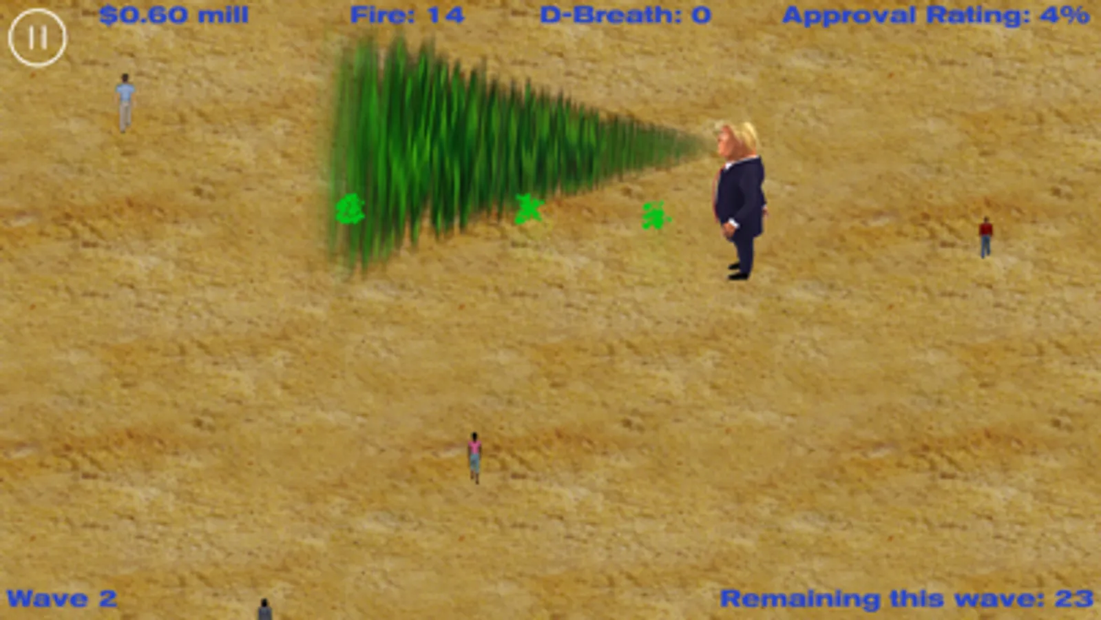 In this game you play Tronald Dump, a small-handed politician who is determined to prevent immigrants from entering his country and defiling the American dream. As Tronald, you must patrol the border and build a wall to keep out illegal aliens. Every zombie immigrant that makes it into America hurts your approval rating. Raise money for your wall by avoiding obstacles such as "Taxes" and "Facts". After each wave of zombie immigrants you can rebuild your wall, buy weapons, and pay for political favors from VP Mike Dense, Fats Fatsie, and Lucifer in The Flesh (a.k.a. Ted Cruz). If you let too many zombie immigrants into your country, you will be impeached!
