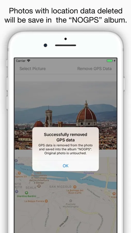 * Location data removed photo is saved in special photo album. Original photo is untouched.