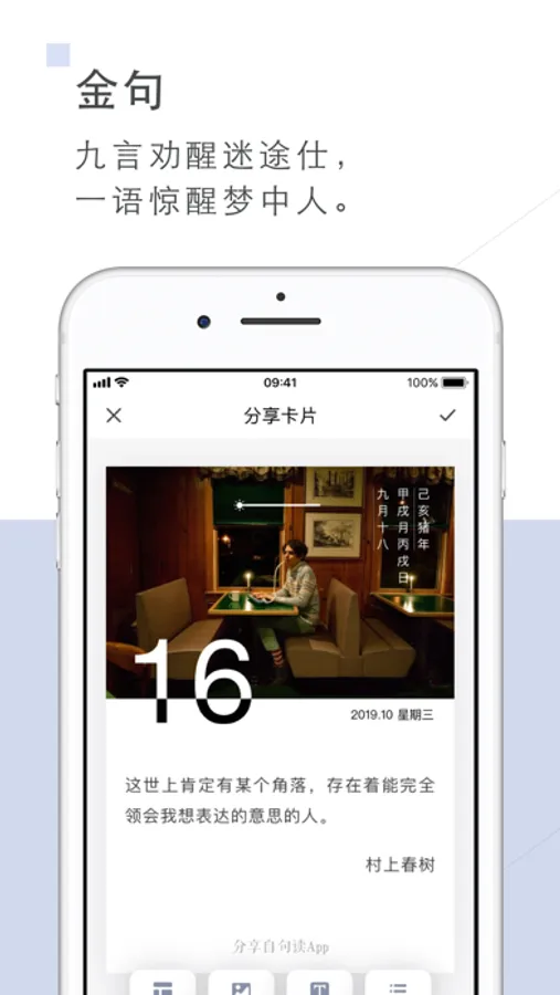 精简的交互操作,简洁大方的UI设计,我们重新定义了句子应用。在这里只有句子,严肃的句子,励志的句子,唯美的句子,心动的句子,伤感的句子,愿你每天能遇到一句让你赏心的话,一幅悦目的图,更愿你因此天天有个好心情。