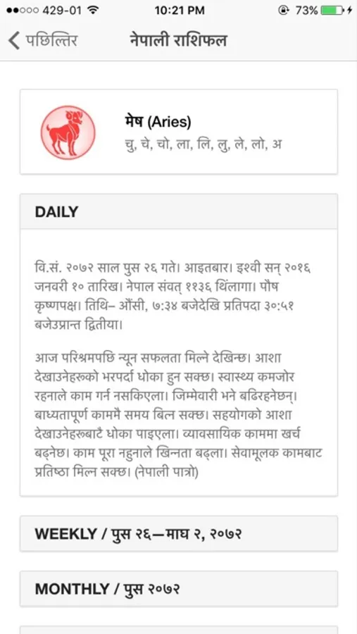 This is a Nepali Rashifal project by Digitalaya. This app displays the horoscope prediction for any given date for Nepalese users in Nepali language that are gathered from various online sources.