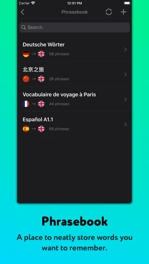 - Phrasebook. It's an easy way to store vocabulary you want to learn. You can save words to Phrasebook directly or shuffle your existing translations to it.
