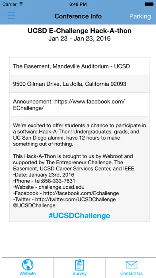 This application is your digital brochure for the UCSD E-Challenge Hackathon. Through this app, you will be able to view all the information about this conference, including, but not limited to: