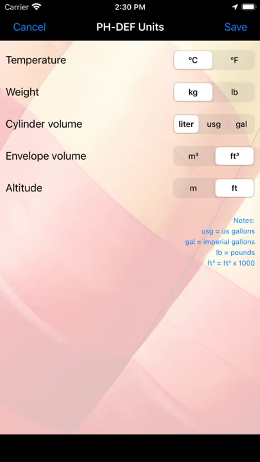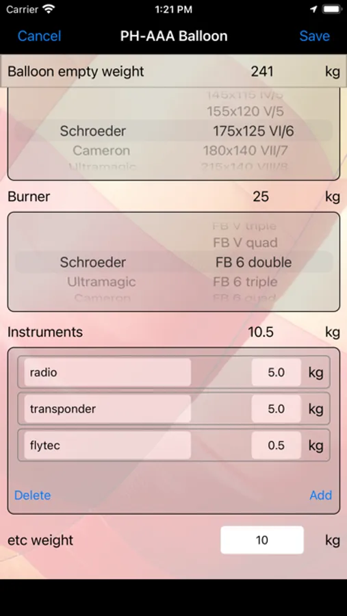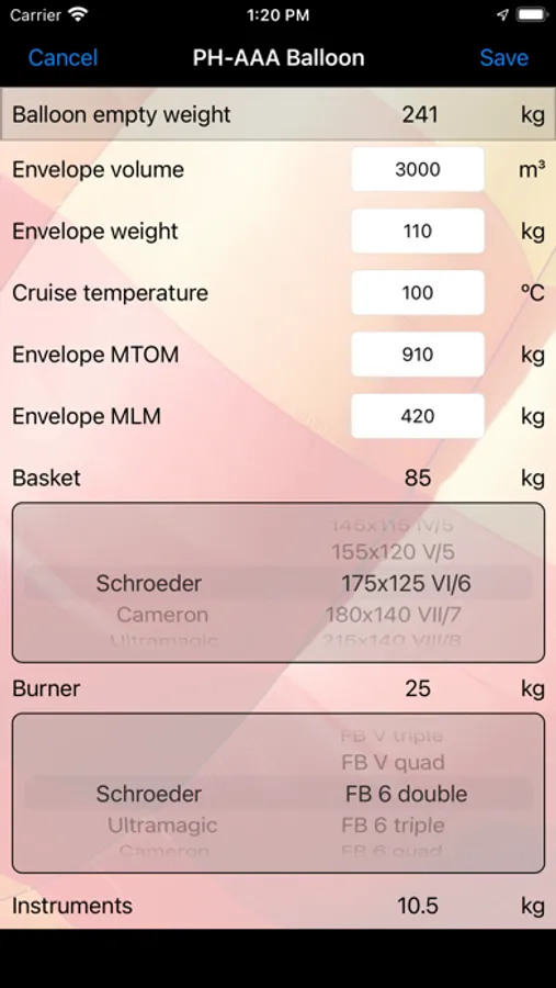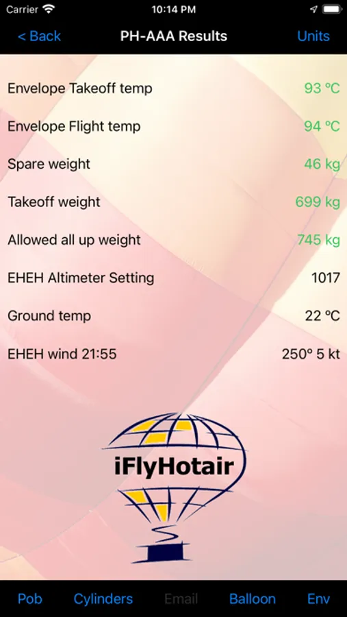 This app was made by balloon pilots for balloon pilots. In case you are missing any cylinder, basket or burner types in the configuration list please supply information details of those to us and we will update the app. For questions or Recommendations please contact info@hotballoon.nl