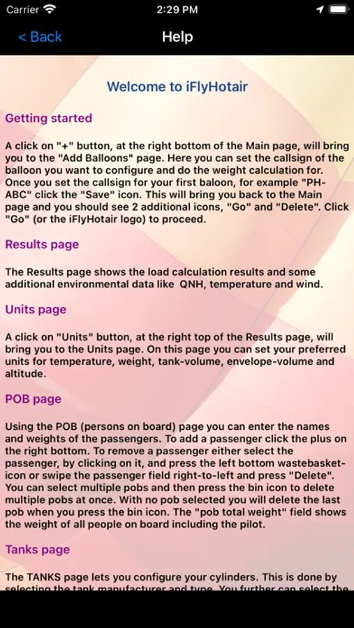 This app is build to make the hotair balloon load calculation as easy as possible for the pilot. The app contains a database of common hotairballoon components available on the market. In case you find missing components please let us know and we will add them to the app. This app is in the appstore for years now. It was recently completely rewritten in Swift to make it easier to maintain in the future. This app works best when you have a WIFI or a mobile network available. It will work offline but it that case more manual setups are required that would be automatic otherwise.