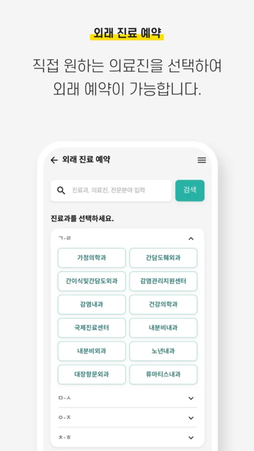 1. 외래 진료 예약 : 직접 원하는 의료진을 선택하여 외래 예약이 가능합니다.