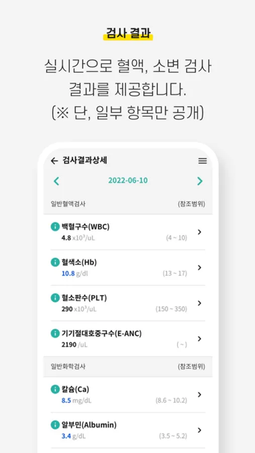 3. 검사 결과 : 실시간으로 혈액, 소변 검사 결과를 제공합니다. (※일부 항목만 공개)