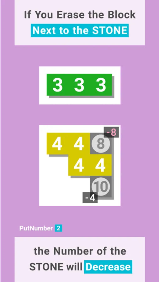 • When a block disappears next to a stone, the number written on the stone decreases, and it finally disappears when it reaches 0 or below.