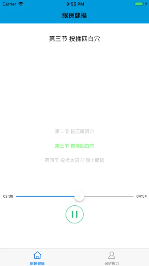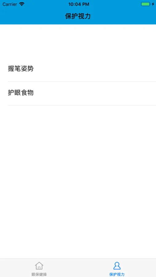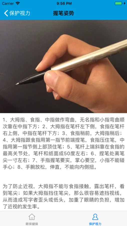 该应用包含眼保健操的播放器,可显示当前眼保健操的当前内容,同时,还给出了合理的握笔姿势的图片及说明,并揭示了握笔姿势和近视的内在联系。