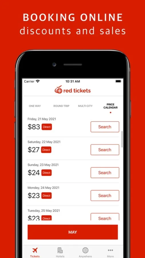 Cheap flights are now available to everyone. With the Red Tickets app it becomes simple and practical. In case you often travel on vacation, business trip, business meetings, visit other cities and countries, install Red Tickets and fly cheap!