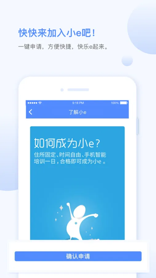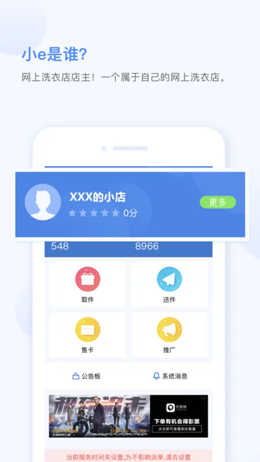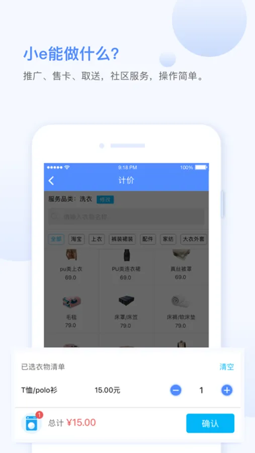 此外,你只需要在app上填写申请,通过e袋洗的专业认证和培训,即可上岗成为e袋洗正式的小e管家,为所在社区的e袋洗用户提供服务。用户通过e袋洗下单,您可通过小e助手app取送衣物、推广新用户、销售充值卡。0成本、0投入当上“互联网洗衣店店主”。由e袋洗提供高品质的洗衣质量和完善的售后支持,全力相助您的小店“茁壮成长”!