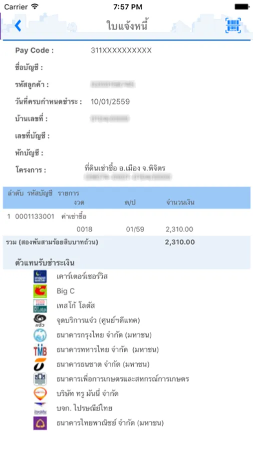 1. แสดงข้อมูลสัญญา/ข้อมูลหนี้ค้างชำระ/ประวัติการรับชำระ