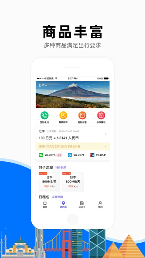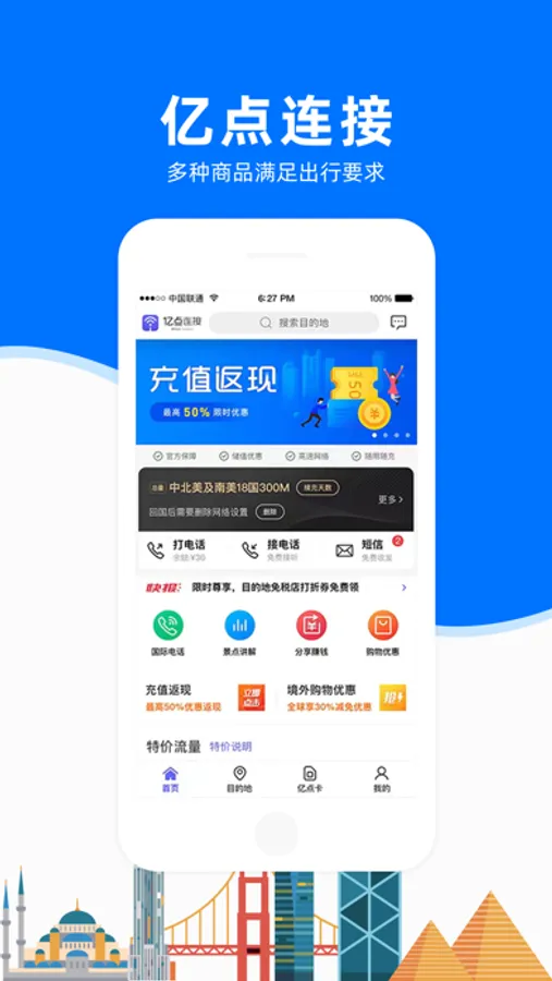 亿点连接专注于为全球旅游人士提供境外上网、国际通话、境外购物优惠、安全用车、免费翻译、目的地景点讲解、汇率计算、目的地天气等多项服务。