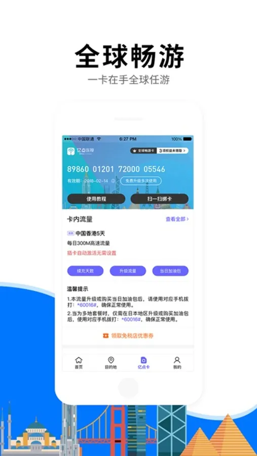 购买亿点上网卡后,打开APP扫码绑卡,即可在“我的亿点卡”随时查看剩余流量,并可离线查看上网和电话的使用教程,首次在APP绑卡可获赠300分钟全球通话。