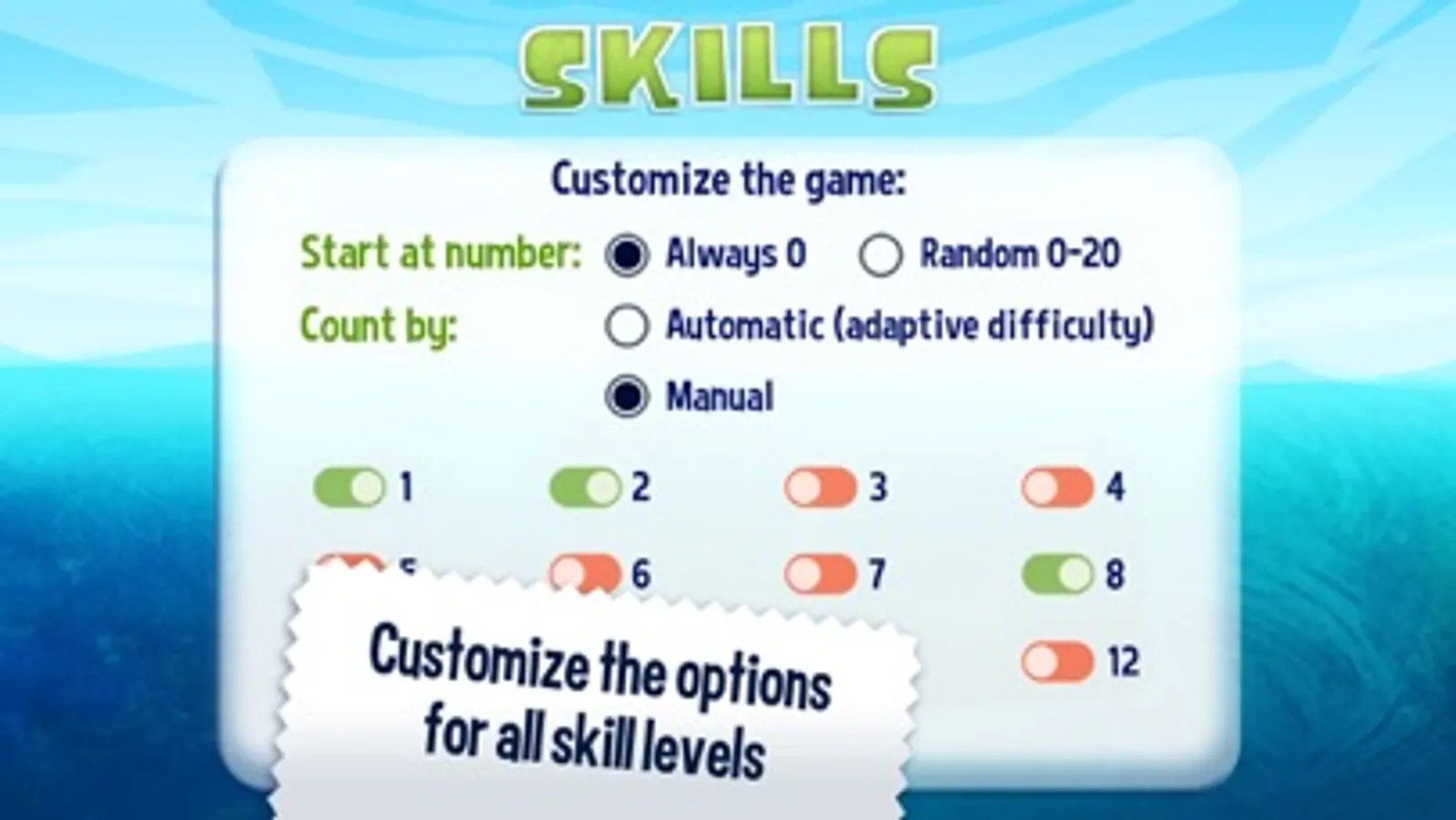 - Choose the specific “Count by” numbers a player is presented with, or play the original adaptive game.