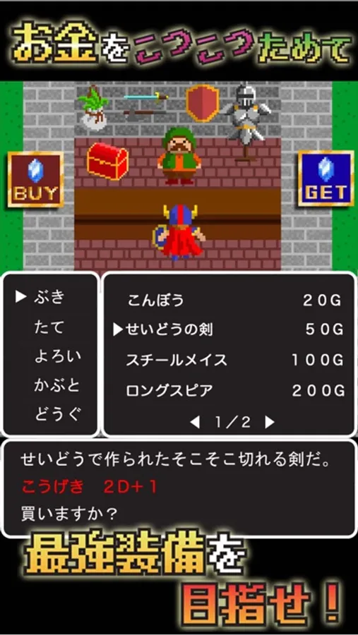 単純に攻撃力が上がる武器もあれば、すばやさが上がる防具、こうげきが強化される道具等バリエーションも豊富。
