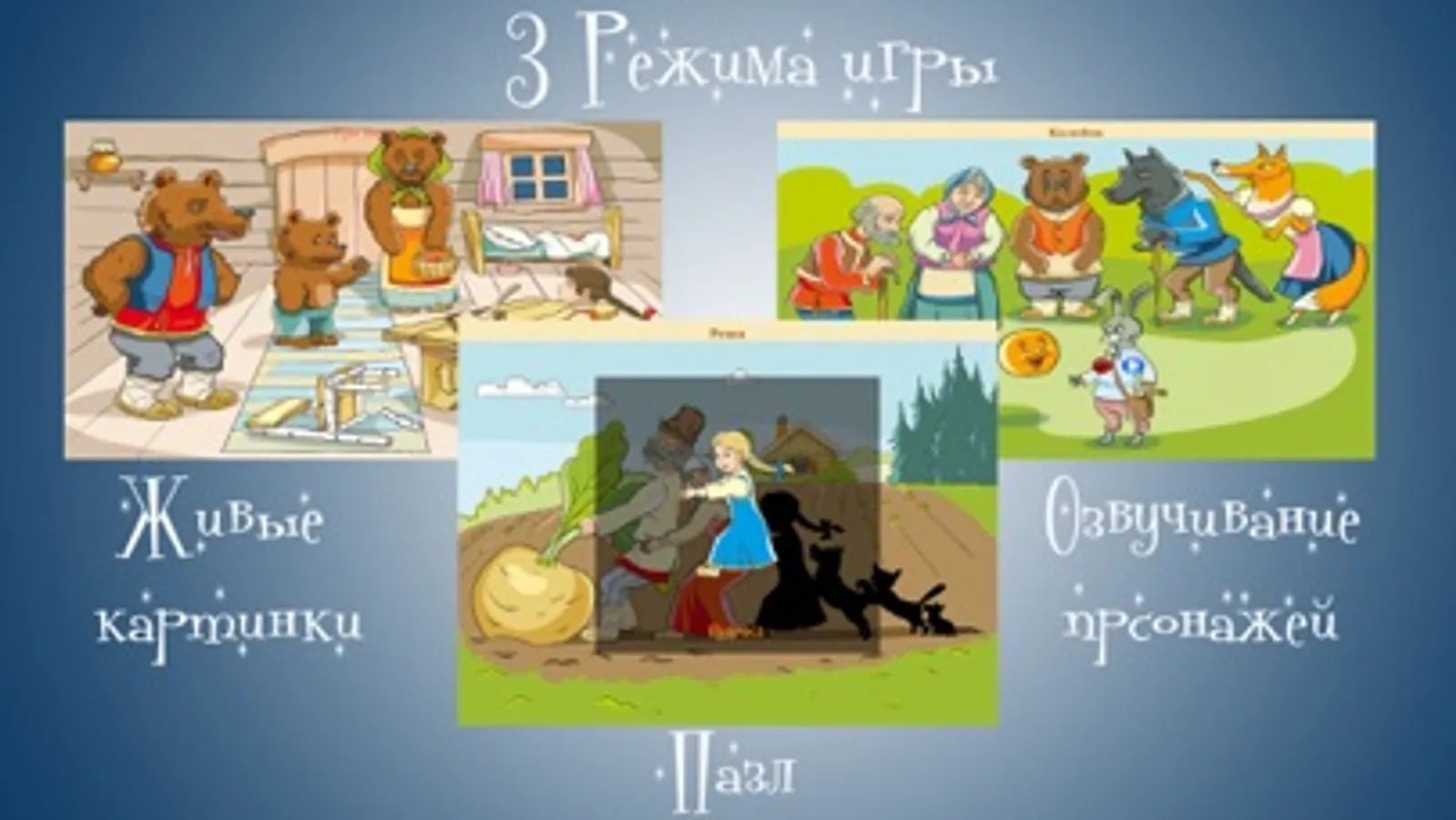 С игрой "Вундеркинд - Народные сказки" Вы сможете озвучить некоторых персонажей своим голосом или же предложить малышу сделать тоже самое, что позволит ребенку изучить новые слова и предметы.