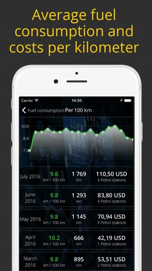- Track fuel consumption and costs per kilometer;