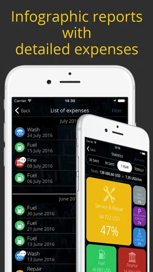 - See expenses analyzed by category, including Gas, Car Wash, Servicing, Repairs, and many others;