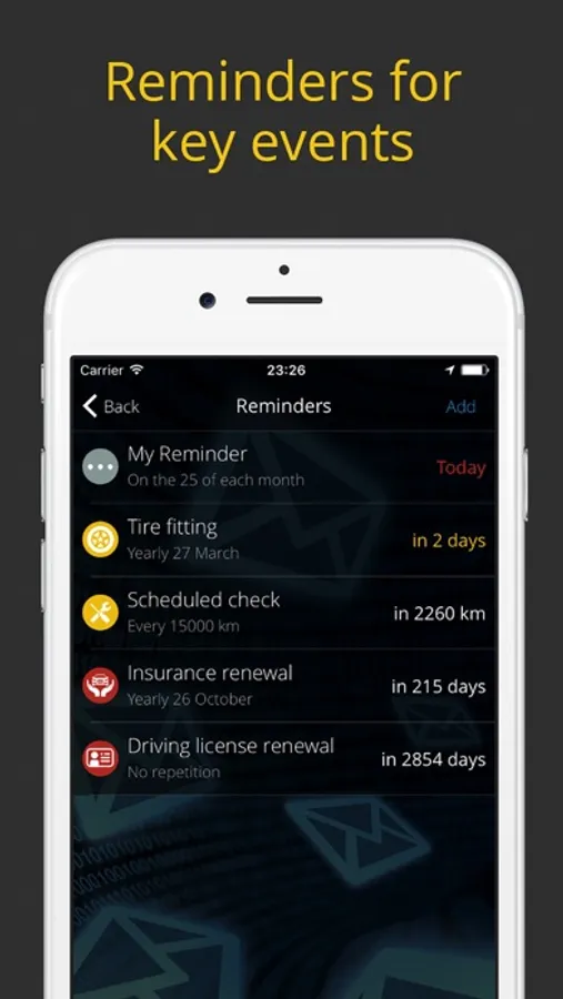 - Receive reminders about Regular Checks, Repairs, Insurance, and more;