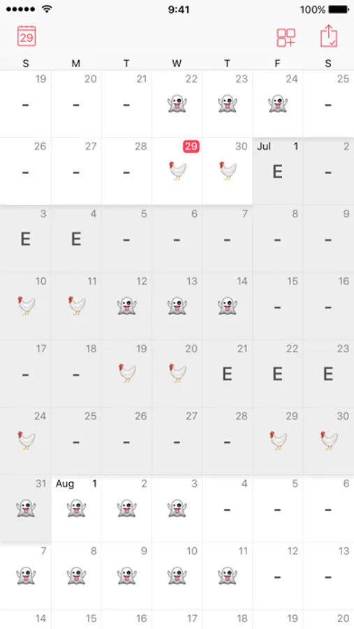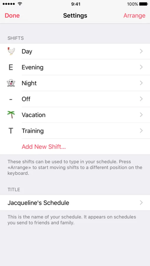 In addition to the typed in schedule, the app also shows the events from your regular calendar app. This way you always have the complete picture. For instance when trading shifts with coworkers.