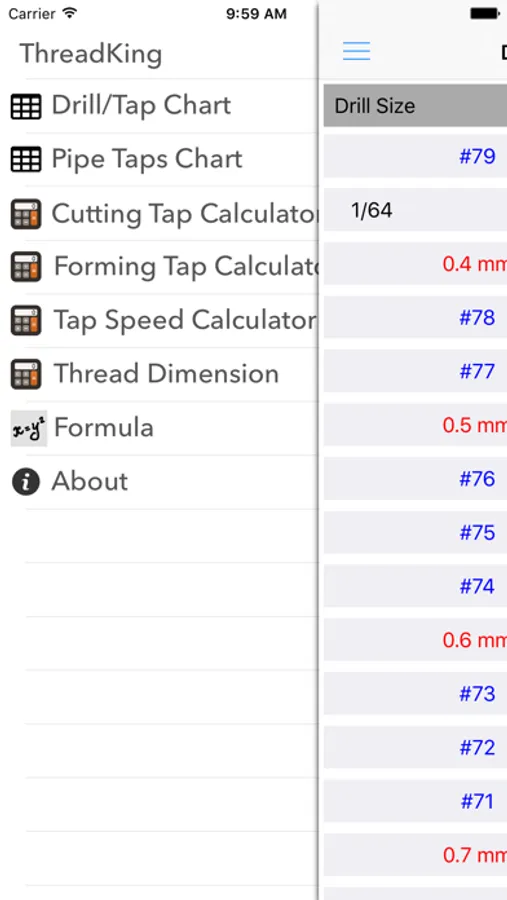 ThreadKing is also a handy calculator for finding the right drill size in Cutting Tap and Forming Tap based on Thread Percentage. Besides, it calculates RPM and feed rates in Cutting Tap for different materials
